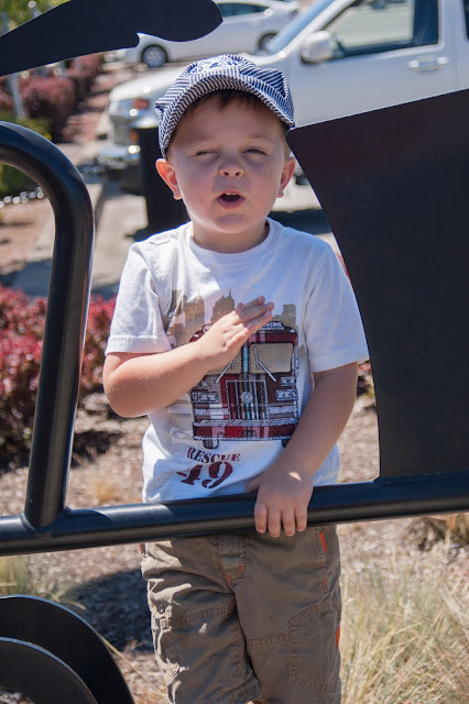 Finally the train arrived. They announced it was on it's way. We lined the boys up by the chain barrier by the platform. An older gentlemen came up and was waiting near us. He said hi and we were visiting a bit. I instructed Peter to do something, like don't shake the chains or something along those lines. The older gentlemen said "oh, you are a Peter too?" Peter looked at him inquisitively. Peter this is Peter I said. His name is Peter too. Still a little confused. Soon the train arrived and we were able to send older Peter off on the train. So fun!